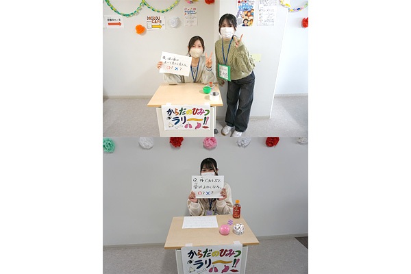 からだのひみつラリーと題して、「ばい菌はよく見ると見える。」や「外であそぶと骨はよわくなる。」といった○×クイズに答えてスタンプを集めてもらいました。