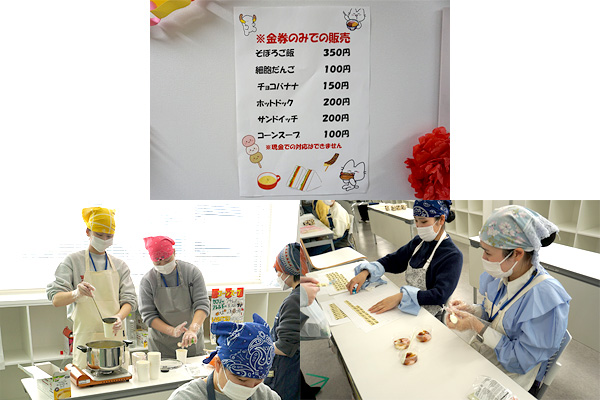 飲食コーナーです。コーンスープや細胞だんご(みたらし団子)などを楽しんでもらいました。
