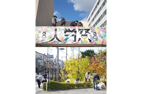 前日の準備風景です。学生が中心となり、協力しあって横断幕を飾りました。