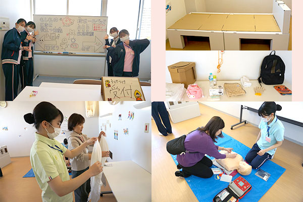 段ボールベッドや災害に備えた持参物品の展示や負傷者が出た場合、三角巾を使った固定方法やAEDの方法を体験してもらいました。
